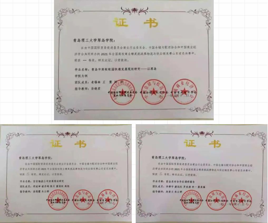 在刚刚过去的2021年全国高校商业精英挑战赛物流与供应链竞赛山东省总决赛中,经贸系物流管理专业派出三支队伍参加。经过不到一个月的时间,在物流管理教研室老师的指导下,三支队伍完成了企业调研、资料整理,以及3w+字调研报告的撰写,最终分别斩获了一等奖1项,二等奖2项的好成绩,学校被评为“最佳院校组织奖”。