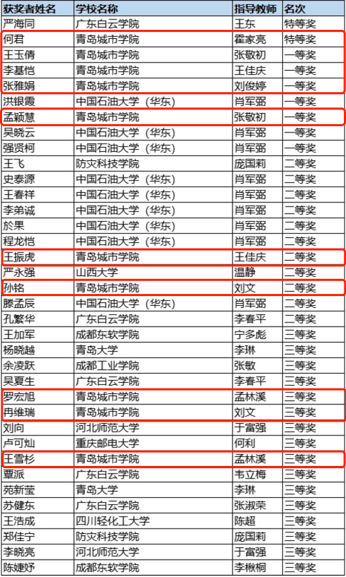 NetAcadRiders选拔赛,何君、王振虎2人获一等奖,王玉倩、张雅娟、孟颖慧、李基恺4人获二等奖,王雪杉、罗宏旭、冉维瑞、孙铭、宋露猛、汪秀瑞6人获三等奖,王子昊、申鹏垚、撖纯阳等35人获优胜奖。