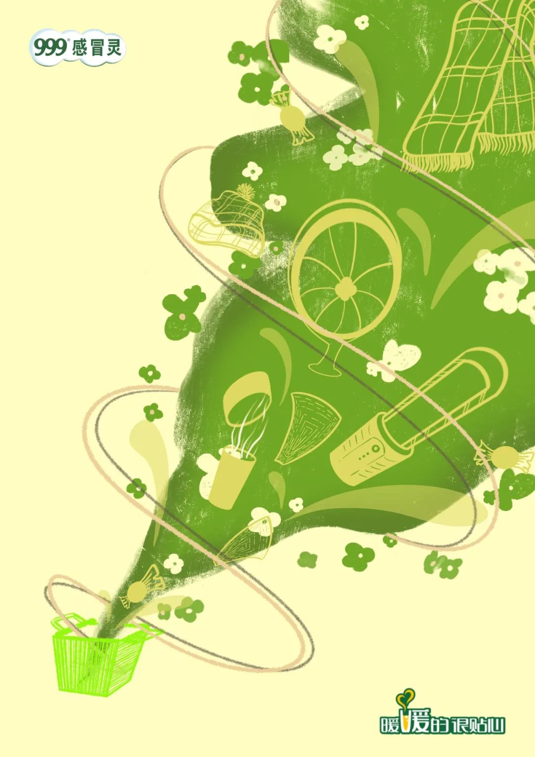 设计说明:以999感冒灵产品周边店为主题,从“暖”的角度出发,购物车中有各种各样暖心暖身暖胃的产品,传达出了999周边店你想要的关于“暖”的产品应有尽有和999对用户们的贴心,让用户在生病的困扰中多了一种温暖的体验。采用了s型构图和对角线构图,使画面整体、统一、有序。其中以绿色为主色,体现出999用心守护每个家庭的健康。