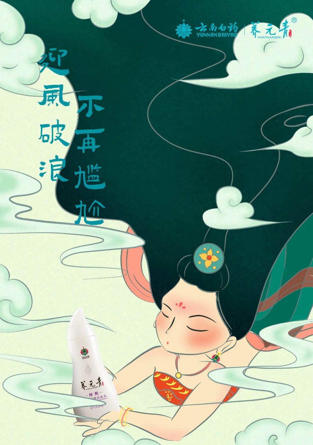 设计说明:作品主题是养元青和敦煌结合创作,采用飞天的形态为素材进行创作,与在高空飞行所遇到的一些棘手的问题结合,表现出养元青的养发、固发效果。