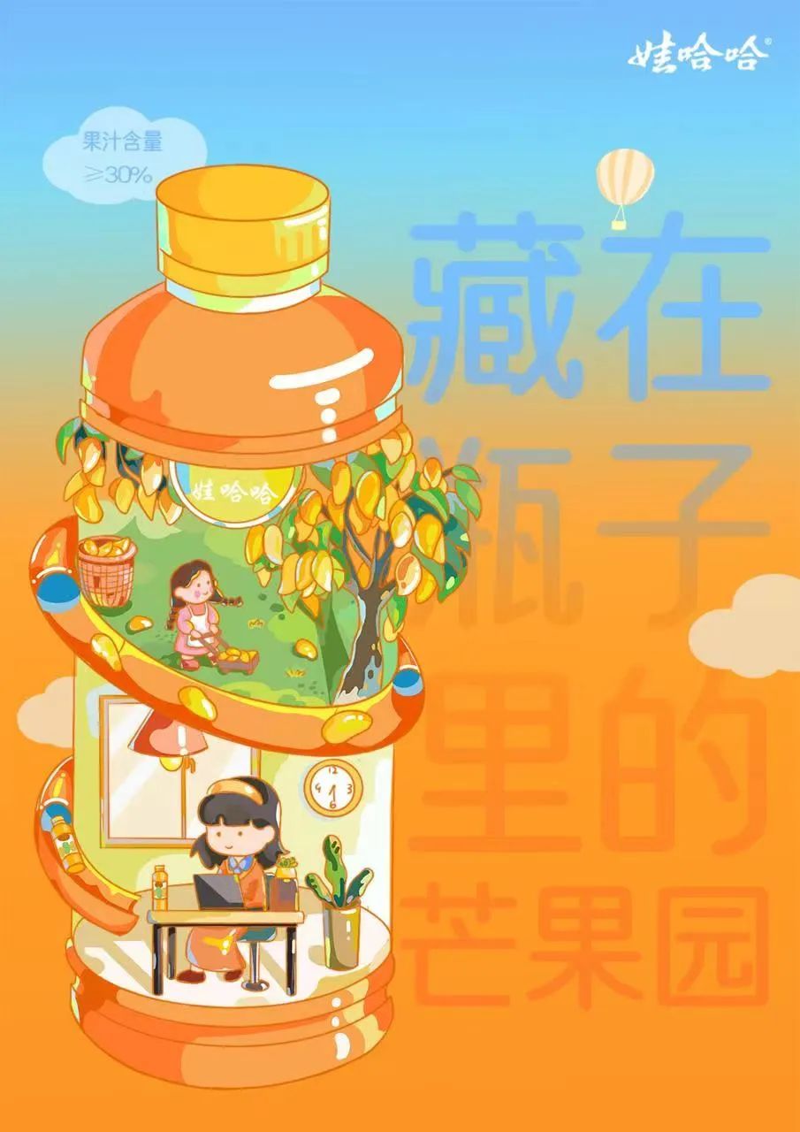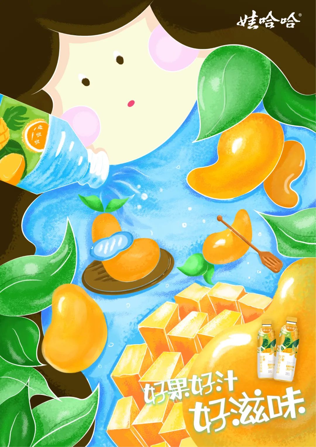 设计说明:娃哈哈果汁饮品的口味,加以可爱的小朋友形象,两者进行对角线构图方式,与娃哈哈果汁饮品健康营养的产品调性相呼应。特殊口味的果汁所呈现特殊的表现效果,在果汁里畅游、划船的小芒果,和爆皮露出果肉的葡萄,小朋友在观察果汁里的小精灵,体现美味活力这一产品特色。