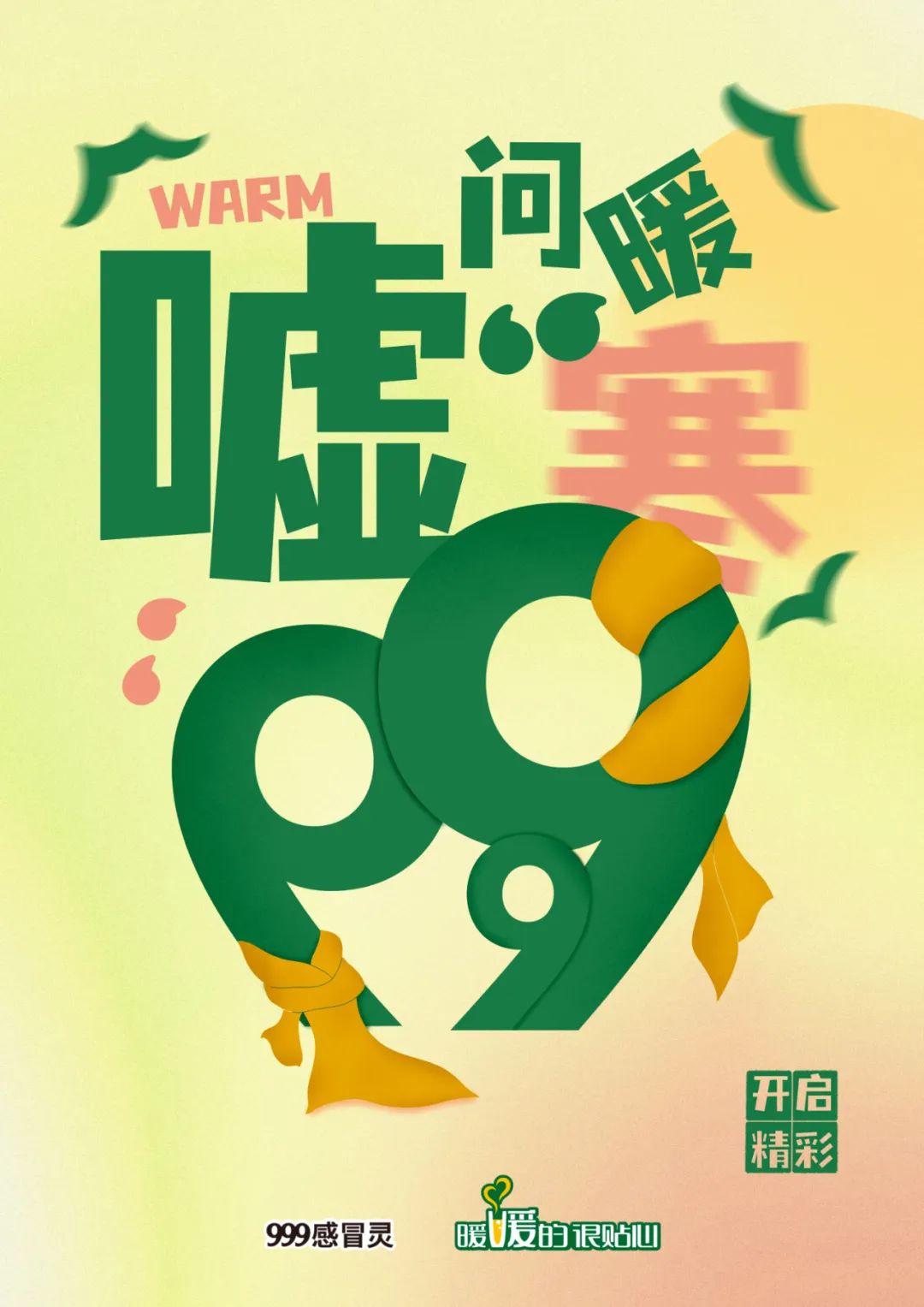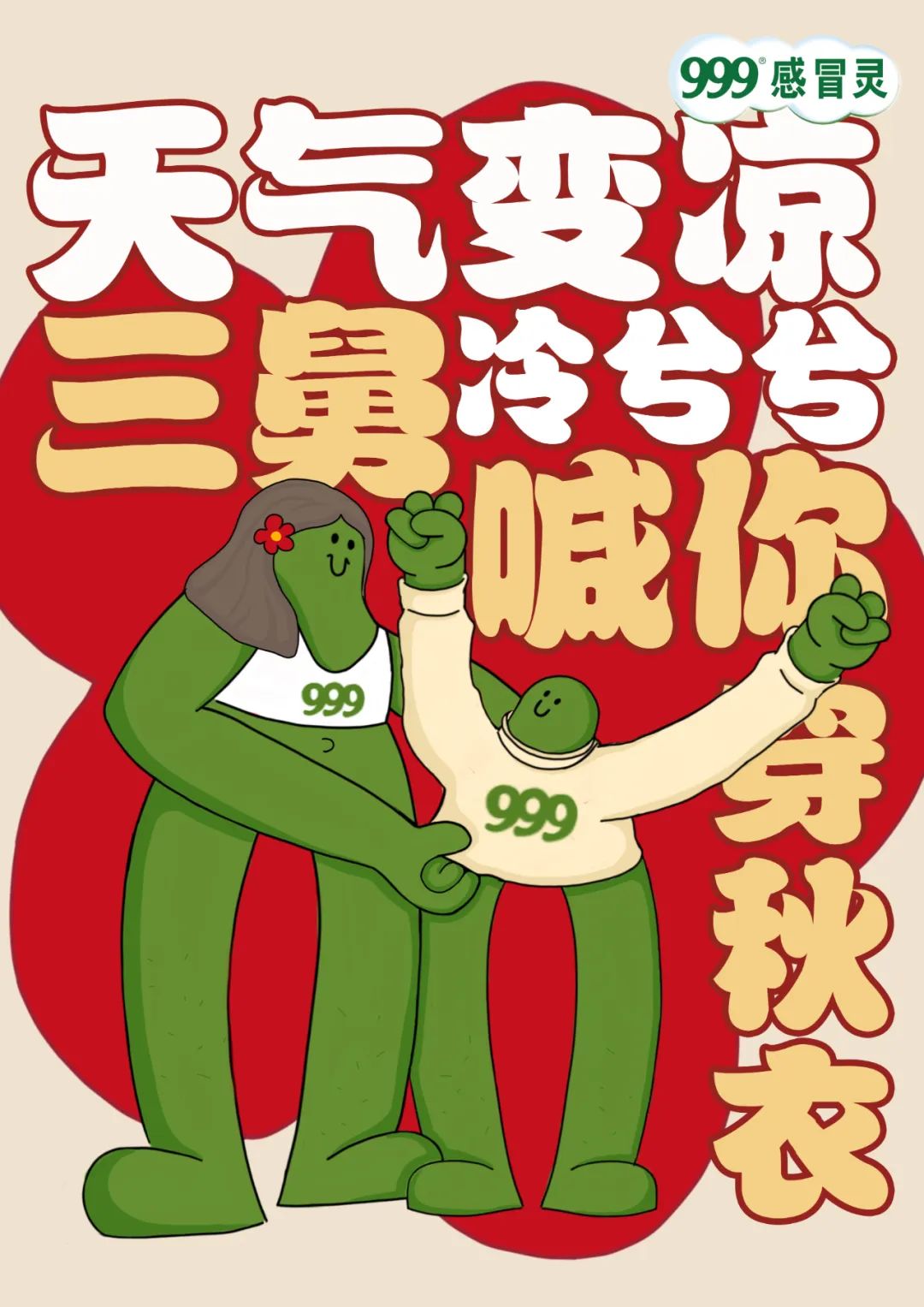 设计说明:999感冒灵"暖暖的很贴心"概念与日常生活中的母爱颇为相似。但日常生活中母爱的表现方式太过于直白,往往显得唠叨。因此,我们将三舅的卡通形象融入海报当中,结合流行顺口的网络用语,传递谐趣幽默的母爱场景,从天冷穿秋衣、按时吃饭、再到早睡早起,这类贴近生活的洞察也更易击中人心。