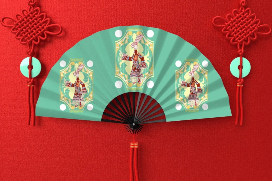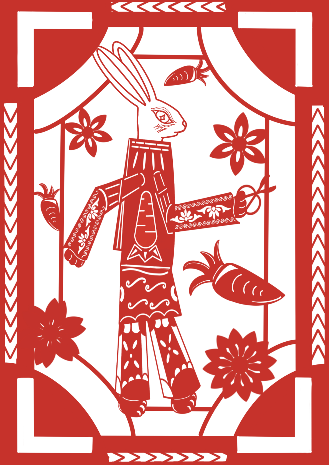 设计说明:插画的主体采用手提着灯笼的兔子形象,兔的身体选用各式各样的花纹等剪纸纹样,兔身关节处内嵌皮影铆钉与皮影戏。整体背景采用祥云纹,使用中国屏风等元素,体现新年的气氛,蕴含着卯门生喜气,兔岁报新春的美好寓意。