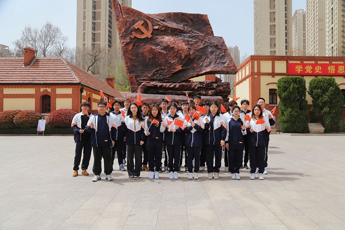 在系统回顾了青岛党组织团结带领青岛人民,争取民族独立、人民解放和实现国家富强、人民幸福的奋斗史后,青年学子们在主雕塑“引领”前合影,飘扬的党旗、奔驰的火车,激励着大家奋勇向前。