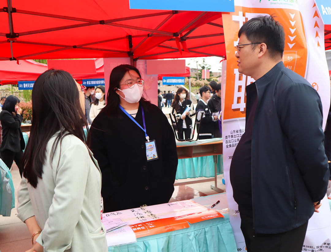 在山东省高校毕业生省级集中招聘会中,外国语学院各毕业班辅导员老师到场与用人单位和应聘学生交流互动,了解行业发展态势和岗位需求,指导学生求职应聘。以招聘会促进学生人岗精准适配。