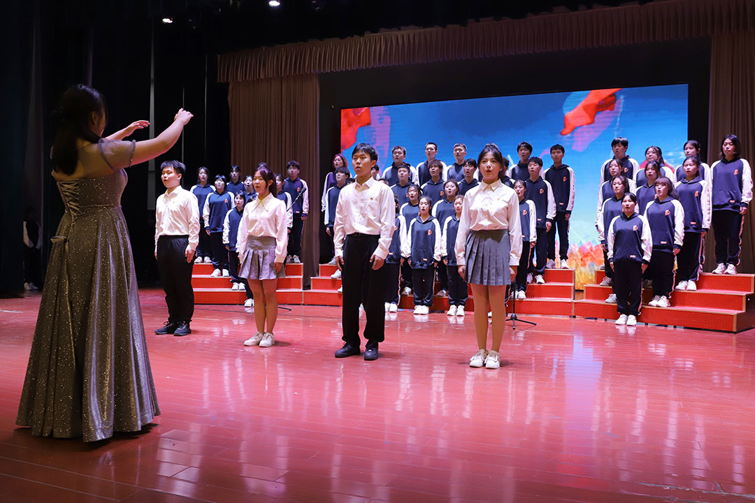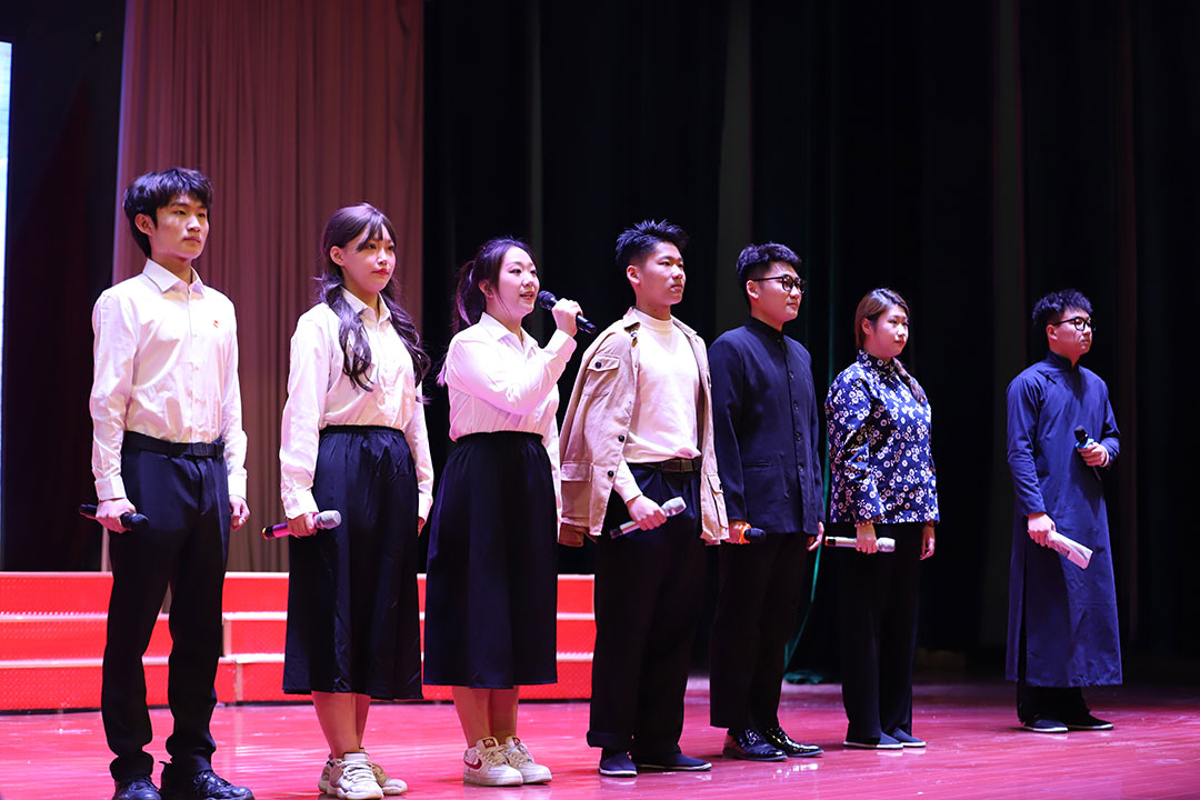 本次大会,除表彰仪式外,青年学子们还倾心呈现了一堂“舞台上的思政课”,将思政教育与艺术表演有机融合。李大钊、刘胡兰、江姐、钱学森、焦裕禄……由7名青年学子演绎的情景朗诵《您是谁》,通过聚焦不同时期的历史事件与模范人物,带领大家沉浸式回顾了党团结带领人民勇毅前行的光辉历程。通过合唱团歌与主旋律歌曲,大家尽情展现着新时代青年应有的锐气与担当,为本次大会画上圆满句点。